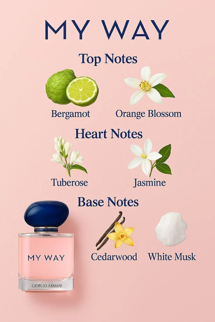 My Way é aquele perfume que conquista sem esforço. Ele abre caminho com uma elegância luminosa e moderna, perfeito para a mulher que sabe exatamente quem é — e que não tem medo de explorar o mundo, viver novas histórias e transformar cada encontro em algo inesquecível.