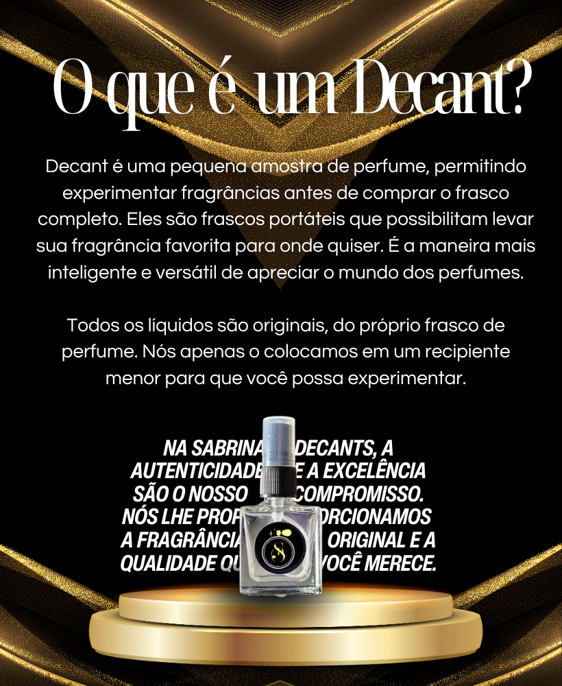 Decants são pequenas amostras fracionadas do perfume original, retiradas diretamente do frasco legítimo e colocadas em vidrinhos menores. Eles permitem que você teste uma fragrância antes de investir no frasco grande — ideal para conhecer o perfume no seu tempo, na sua pele, no seu dia a dia.
