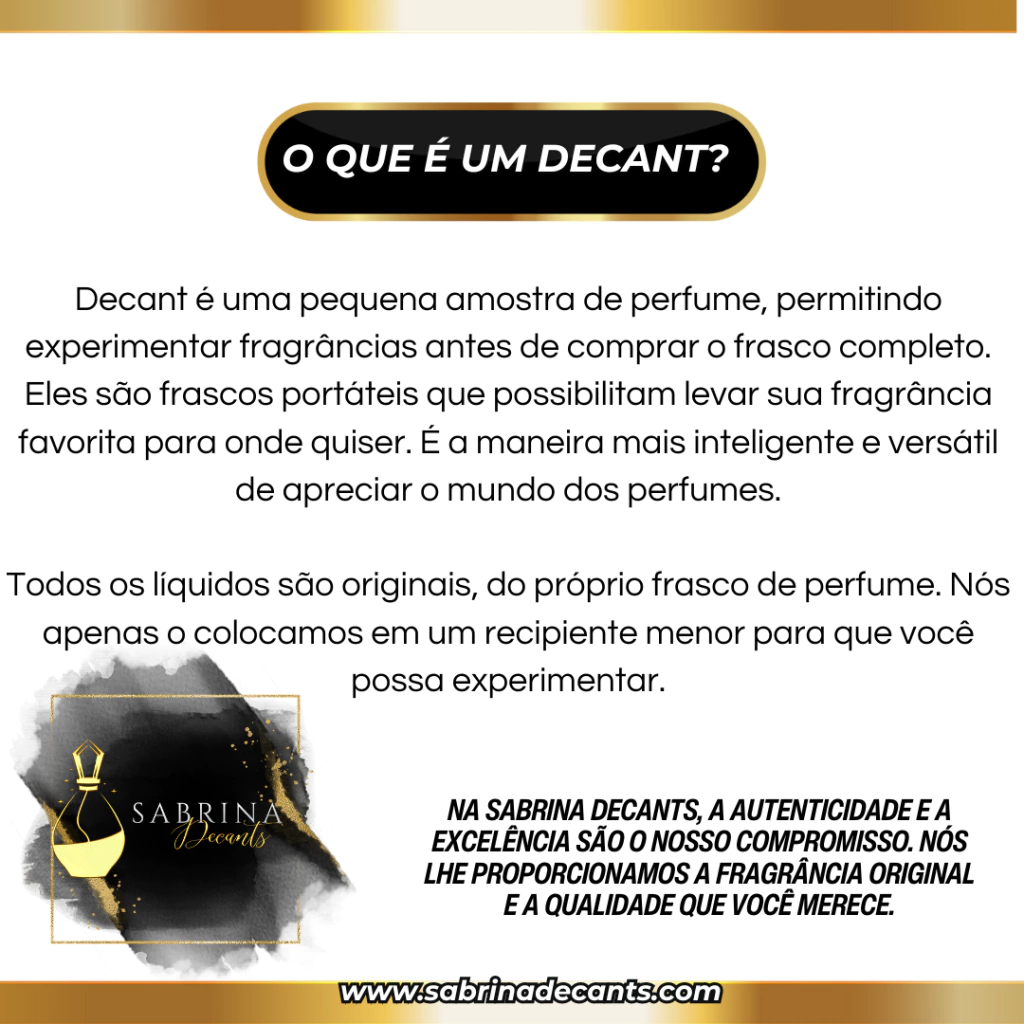 Visando a segurança, higiene e conformidade legal, informamos que, por razões de preservação da qualidade e integridade dos produtos, não efetuamos trocas de decants e de produtos em tamanho grande. Agradecemos pela compreensão e colaboração com nossa política para assegurar a melhor experiência em perfumaria personalizada.